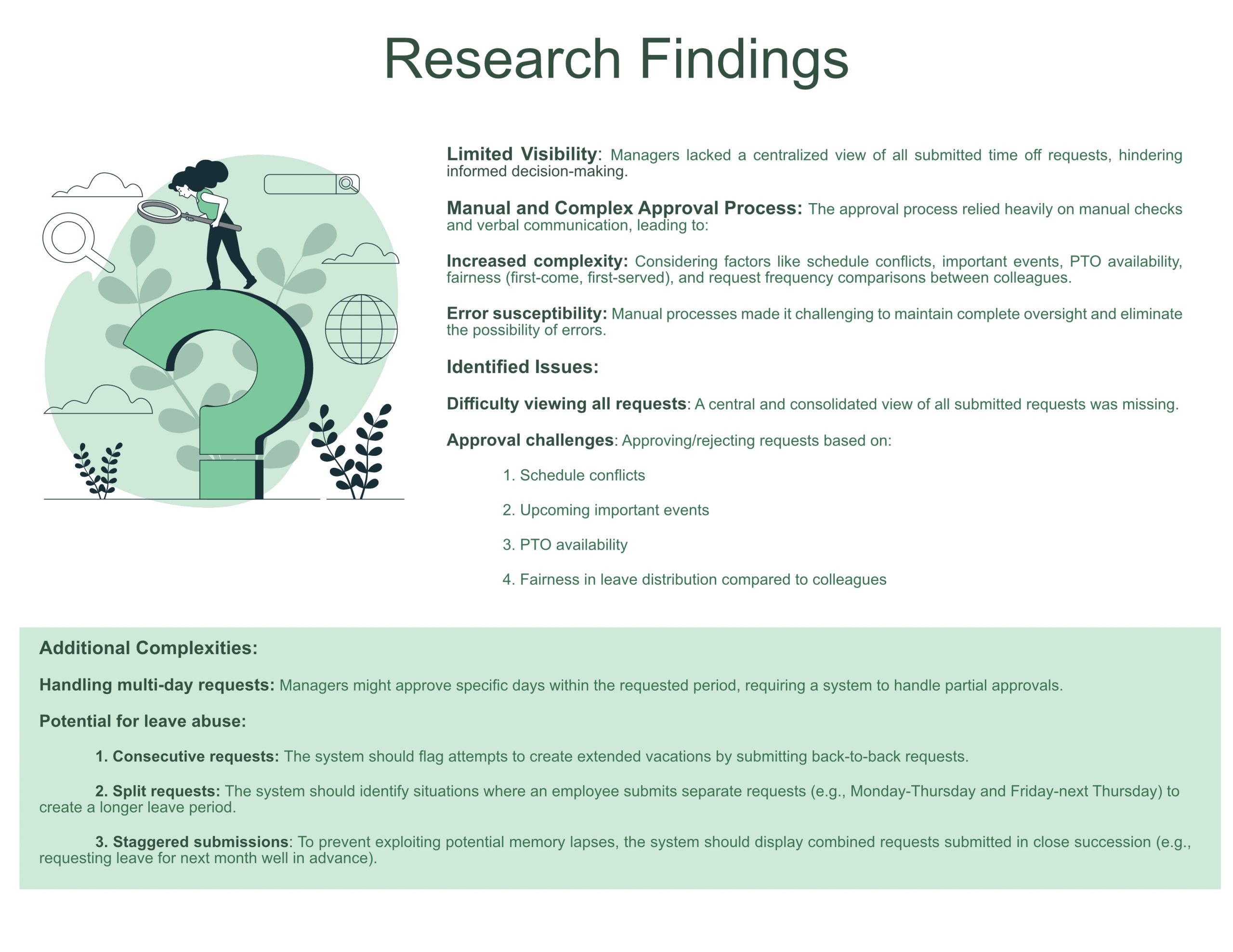 The Product Requirements Document (PRD) fell short of capturing the full scope of user challenges. Users experienced significant frustration due to the manual nature of the process, a lack of end-to-end visibility, and an overly complex approval system. Here are some of the key findings
